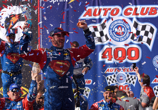 Jimmie Johnson (Chevrolet) logró su segunda victoria de la temporada en el óvalo de Fontana, consiguiendo además la número 77 de su carrera. Ahora, Johnson superó a Dale Earnhardt en el séptimo lugar en victorias de NASCAR.