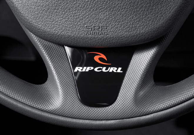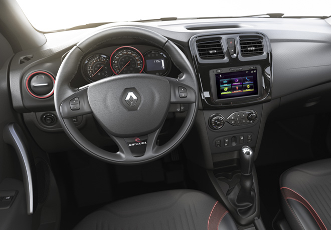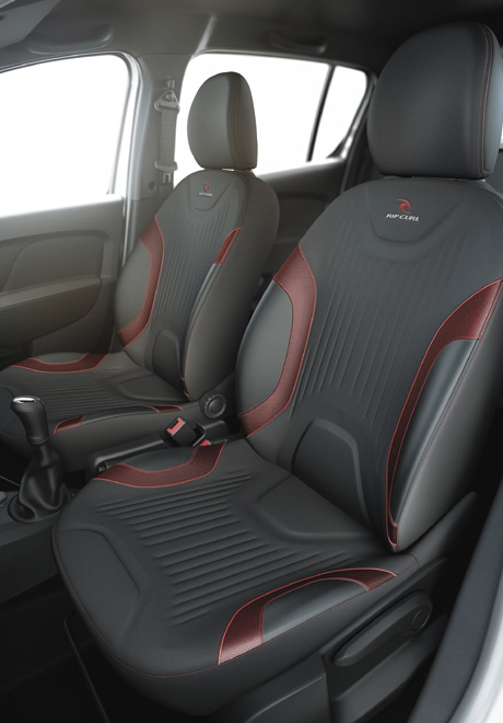 En el interior, sumado al confort y habitabilidad característicos del Sandero Stepway, se suman terminaciones en perfecta sintonía con el espíritu outdoor. Se destaca el logo Rip Curl en los asientos delanteros, totalmente rediseñados con líneas color rojo en las sujeciones laterales, en el volante, como así también en el tablero y salidas de aire.
