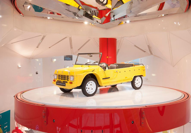 Esta nueva temporada homenajea al Citroën E-Méhari con la exposición de cuatro modelos de todos los colores: Naranja Mecánica, Grand Bleu, Yellow Submarine y Beige de Jour. Para completar el cuadro, tres Méhari originales se exponen en los pisos intermedios: uno beige de 1969, uno verde de 1971 y uno amarillo de 1981.