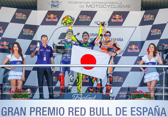 El Gran Premio Red Bull de España de MotoGP ha dejado esta tarde como ganador en el Circuito de Jerez a Valentino Rossi (Movistar Yamaha MotoGP), que llegaba a la meta con un margen de 2,3 segundos sobre su compañero de equipo y campeón de la categoría reina, Jorge Lorenzo, y el actual líder del campeonato Marc Márquez (Repsol Honda Team).