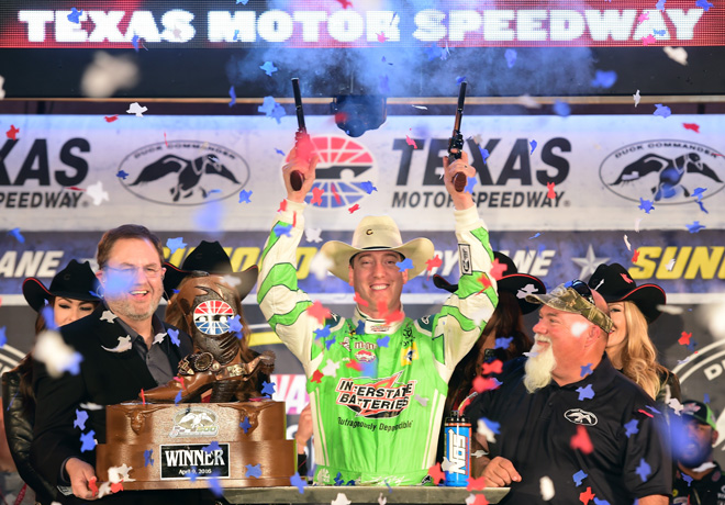 Kyle Busch (Toyota) se alejó de sus perseguidores después de un reinicio faltando 33 vueltas para el final en la noche de Texas y consiguió su segunda victoria consecutiva de la Copa Sprint de NASCAR.