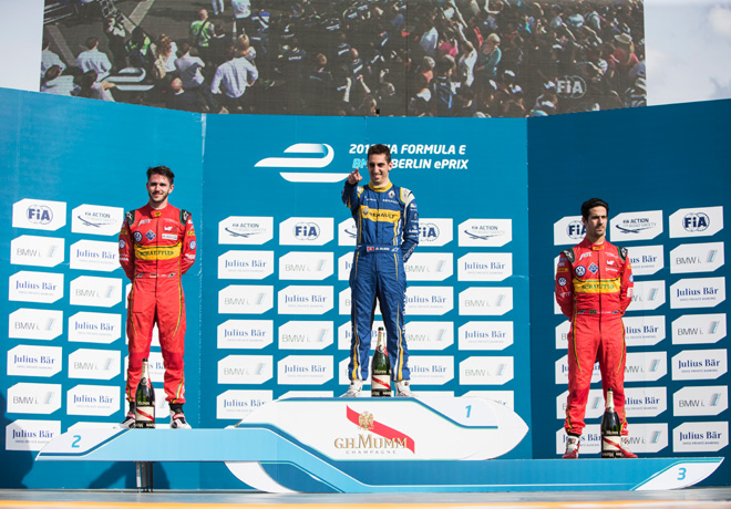 Formula E - Berlin - Alemania 2016 - Daniel Abt - Sebastien Buemi - Lucas Di Grassi en el Podio