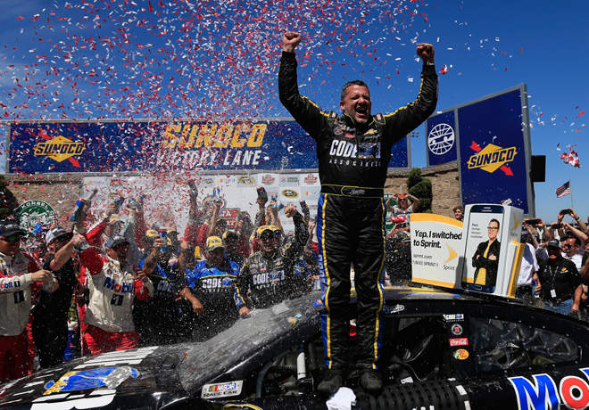 En una apretada definición Tony Stewart (Chevrolet) se impuso en Sonoma después de pasar mediante un roce a Denny Hamlin (Toyota) en la última curva para conseguir su primera victoria en la temporada en la Copa Sprint.