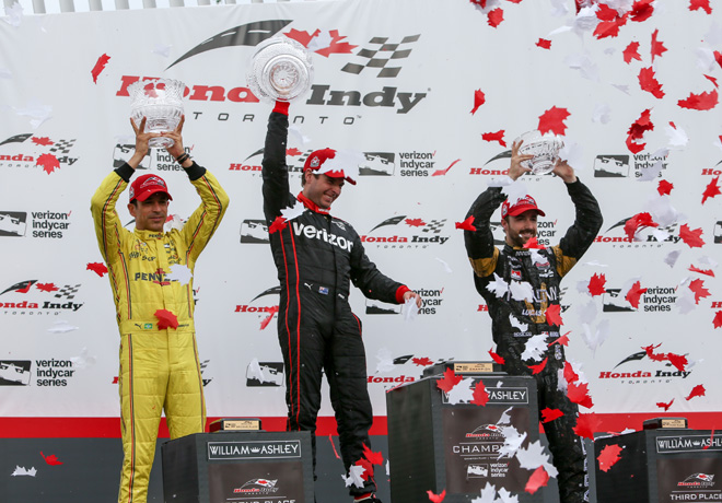 Will Power logró su tercera victoria de la temporada en Toronto, Canadá, un circuito callejero de 2.824 metros de extensión, gracias a una acertada estrategia del equipo Penske, superando por 1.5275 segundos a su compañero Helio Castroneves.