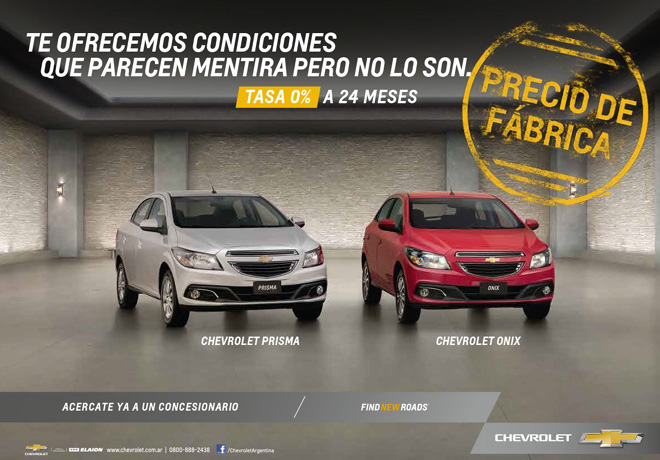 En esta ocasión, todos los clientes que se acerquen a la Red de Concesionarios Chevrolet en el mes de agosto, podrán llevarse su Chevrolet Onix o Prisma a precios de fábrica, y además con Tasa 0% de Interés a 24 meses. También, durante todo este mes, Chevrolet ofrecerá excelentes condiciones, tanto de bonificación como de financiación para muchos de los modelos de su portfolio.