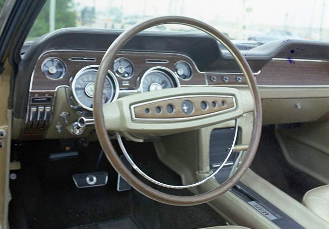 - 1968: El Mustang introdujo la columna de dirección retráctil para reducir la posibilidad de lesión en caso de accidente, aumentando la seguridad. El volante de dos rayos también ganó una sección central y acolchada, con control de bocina en el aro central.