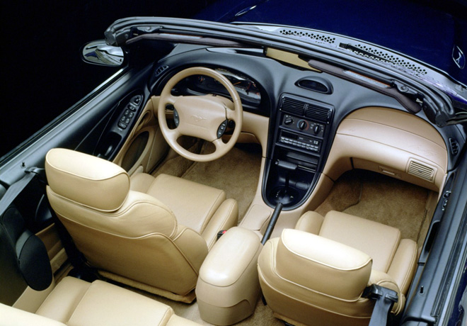 - 1994: La cuarta generación del Mustang fue un homenaje al modelo original de 1964, con cabina doble y formas talladas en el panel. Varios comandos se ubicaron para un uso más simple, aumentando la practicidad y seguridad. La bocina, volvió al centro del volante, integrada en la tapa del airbag.
