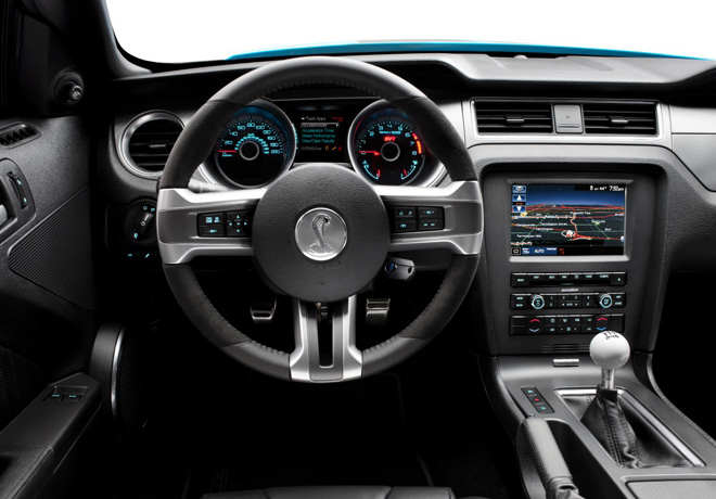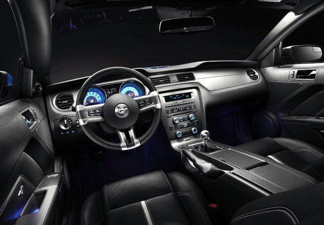 - 2010: Con la tecnología SYNC, muchos botones fueron agregados para los comandos de voz del teléfono, música, radio y otras funciones. El emblema central de acrílico fue cambiado por uno de aluminio pulido, con el caballito estampado o la cobra en el caso del Shelby GT500. Los acabados de aluminio o cuero daban unidad a la cabina.