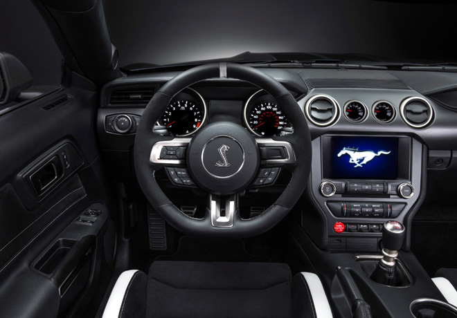 - GT350: Las versiones homologadas para la calle que más se aproximan a un vehículo de competición son los Mustang Shelby GT350 y GT350R con volante de base recta y revestimiento de Alcántara, inspirado en los autos de carrera. Sus controles permiten hacer innumerables ajustes en el vehículo sin sacar las manos del volante, incluyendo el nivel de asistencia de la dirección eléctrica, la suspensión, modos de dirección y afinamiento del escape. En el Shelby Cobra, también es el único lugar del auto donde se encuentra su logotipo.