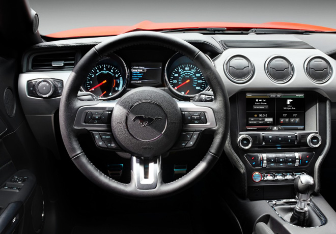- 2015: En la sexta generación del Mustang, el volante, totalmente rediseñado, incorpora hasta 20 botones. Los de la derecha comandan el SYNC y la radio. Los de la izquierda, controlan el control de velocidad crucero adaptativo y la pantalla del panel de instrumentos. Los controles de marcha al volante “paddle shift” fueron ofrecidos por primera vez en el Mustang con transmisión automática. Su airbag circular fue proyectado especialmente. Es también el volante de menor diámetro de la marca, con apenas 14 pulgadas. Los rayos de aluminio tienen un acabado en los bordes para que el conductor solo toque el cuero y tenga mejor dominio del volante.