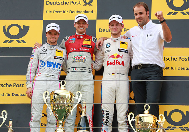 Edoardo Mortara (Audi), saliendo desde el sexto lugar, fue el vencedor de la competencia disputada hoy en el circuito de Nürburgring de 3.629 metros de extensión, una carrera pactada a una hora de duración más un giro y con una parada obligatoria en boxes. Segundo finalizó Lucas Auer (Mercedes-AMG) y tercero Marco Wittmann (BMW).