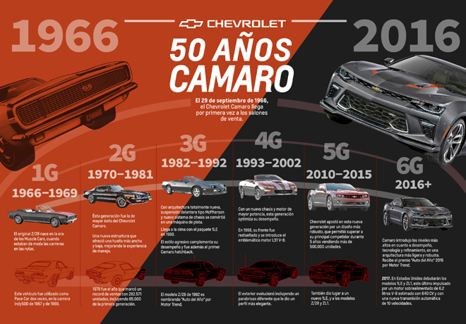 Chevrolet celebra los primeros 50 años de vida del Chevrolet Camaro. En este primer medio siglo la leyenda de los deportivos de la marca ha tenido 6 generaciones, todas distinguidas por un estilo único, que capturaron el diseño y espíritu de las respectivas tecnologías de época y desempeño que, a la fecha, siguen enfocadas en la experiencia de manejo que hizo de él un éxito desde el primer día.