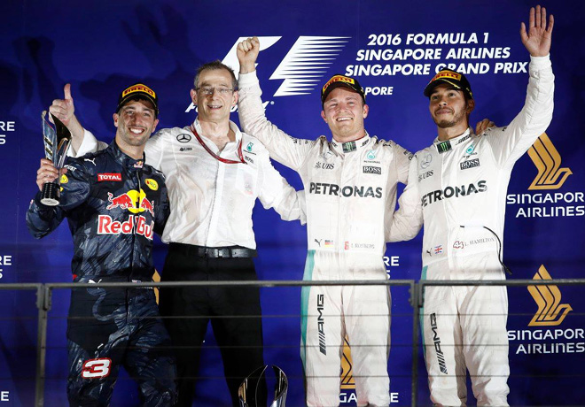 Nico Rosberg con el Mercedes consiguió una importante y ajustada victoria que le permite reconquistar la punta del campeonato de pilotos que habÃa perdido en HungrÃa. El alemán y su equipo adoptaron la estrategia de dos paradas, mientras que su escolta Daniel Ricciardo (Red Bull Racing) lo hizo en tres oportunidades. Ello le permitió al australiano descontar la ventaja que le llevaba Rosberg y terminó a sólo 488 milésimas del vencedor.