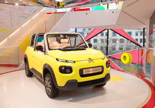 El Citroën E-Mehari es de una personalidad única, ya que propone un frente delantero que retoma los códigos estilísticos de Citroën, así como múltiples posibilidades de personalización con 4 colores de carrocería (uno Azul, uno Naranja, uno Amarillo y uno Beige), 2 colores de capota y dos colores de asientos;