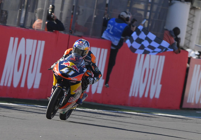 Brad Binder (Red Bull KTM Ajo) se alzó con la victoria en Moto3, con una ventaja de sólo 56 milésimas sobre Joan Mir (Leopard Racing) y de 81/1000 respecto de Andrea Migno (SKY Racing Team VR46).