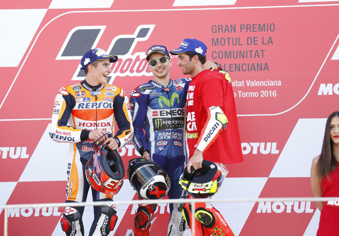 El Gran Premio de la Comunidad Valenciana de MotoGP se disputó en el circuito Ricardo Tormo con la victoria de Jorge Lorenzo (Movistar Yamaha MotoGP), la última con Yamaha, quien llegaba a la bandera de cuadros por delante de Marc Márquez (Repsol Honda Team) y Andrea Iannone (Ducati Team).