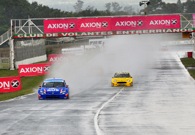 La lluvia se hizo presente un instante antes de la largada, agregándole un condimento extra a la apasionante definición de la categoría en el histórico trazado de Paraná. La competencia se lanzó con procedimiento de pista húmeda en fila india y esto benefició a Diego Azar, quien largó con más comodidad. Antonino García se acomodó como escolta.