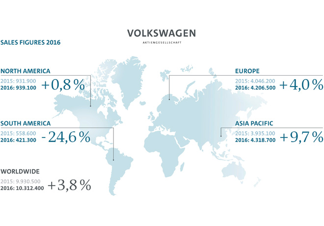 El Grupo Volkswagen entregó 10,3 millones de vehículos en el mundo en 2016, lo que implica un aumento de 3,8% respecto de las entregas realizadas en 2015. Durante el mes de diciembre se registró un aumento de 11,8%, con 933.300 unidades entregadas.