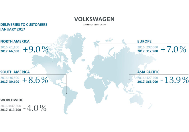 El Grupo Volkswagen entregó 813.700 vehículos en el mundo en enero de 2017. “Luego del gran crecimiento que logramos el año pasado, las ventas en este primer mes del año se vieron afectadas por una significativa baja de entregas en China que creemos pudo haber sido por el año nuevo chino. Igualmente estamos seguros que las ventas en ese mercado crecerán a lo largo de este año”, señaló Fred Kappler, director de Ventas del Grupo Volkswagen AG respecto las ventas del primer mes del año, y destacó que “si no tenemos en consideración los resultados en China, el Grupo registró un sólido crecimiento de 4,9% en el mundo”.