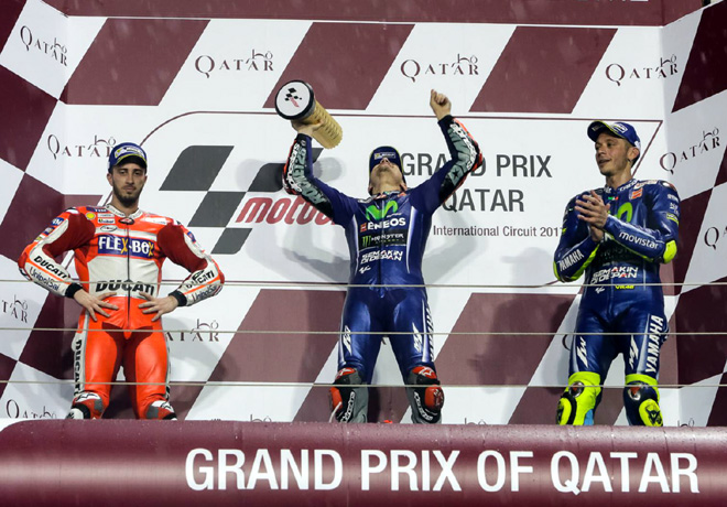 Lluvia, retrasos, incertidumbre y una carrera acortada a 20 vueltas han sido los ingredientes de una noche que tardará en ser olvidada por los pilotos de la categoría reina. MotoGP está de vuelta para disputar la temporada 2017, y Maverick Viñales (Movistar Yamaha MotoGP) retuvo los titulares que ocupó durante la pretemporada tras conseguir su primera victoria como piloto oficial de Yamaha.