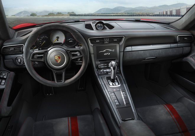 El interior de este nuevo deportivo de altas prestaciones se ha adaptado a la experiencia de conducción del 911 GT3. El volante deportivo GT, con un diámetro de 360 mm, proviene del 918 Spyder. Tanto el conductor como el pasajero disfrutan del dinamismo en unos asientos Porsche Sports Plus, con refuerzos laterales de sujeción y ajuste mecánico longitudinal. La altura y posición del respaldo tienen regulación eléctrica. Como el 911 GT3 es tradicionalmente un biplaza, la zona donde suelen ir los asientos traseros está cubierta.