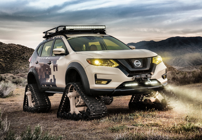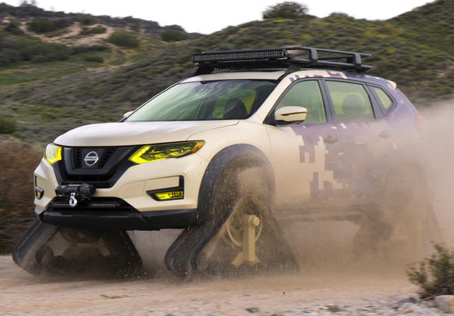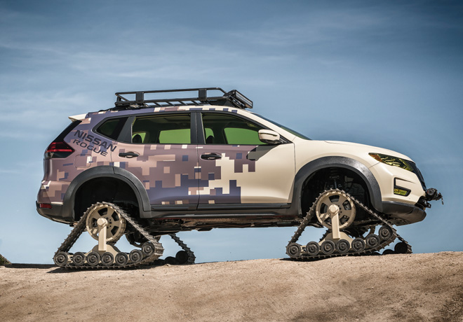 Los ejes fabricados por American Track Truck, reemplazan a los rines y neumáticos habituales del Nissan Rogue. La suspensión y los rines fueron modificados para adaptarse al nuevo sistema, mientras que el motor 2.5 litros de 16v y la transmisión Xtronic CVT son iguales a las que incluye el automóvil de producción regular. Los faros coloridos; la parrilla frontal personalizada; las luces LED y el cabrestante «Warn 4K» completan la lista del nuevo equipamiento.