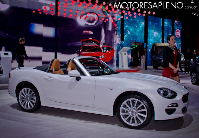 - La otra nueva primicia para los argentinos en el Salón de Buenos Aires es el nuevo Fiat 124 Spider, del que se exhibe en el Italian Garage una unidad en color Blanco equipado con un cuatro cilindros turbo de 1.4 litros, tecnología MultiAir, que proporciona 140 CV de potencia y 240 Nm de par, unido a una transmisión manual de seis velocidades. El rendimiento es excepcional: una velocidad máxima de 215 km/h con una aceleración de 0 a 100 km/h en 7,5 segundos.