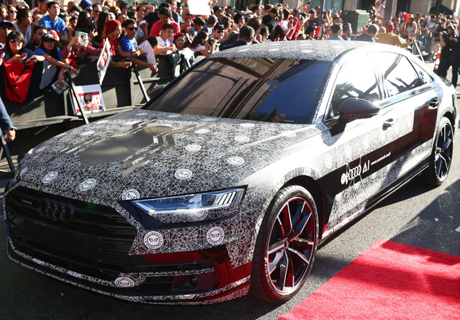 Normalmente los equipos técnicos de Audi ocultan sus prototipos secretos con una lámina adhesiva especial con un patrón de camuflaje de remolinos blancos y negros. Sin embargo, en esta oportunidad, la automotriz alemana ha desarrollado una nueva filmina de camuflaje con un diseño de Spider-Man para la aparición especial en la alfombra roja. El diseño tradicional de remolino se ha modificado para incorporar telas de araña en las puertas del nuevo Audi A8 y en los anillos.