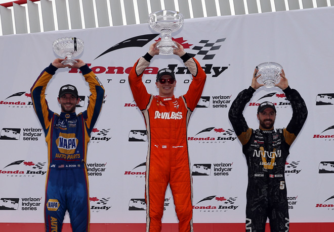 Gracias a una perfecta estrategia, Josef Newgarden consiguió hoy la victoria en Toronto. Conduciendo el Penske Chevrolet número 2, Newgarden ganó por 1.8704 segundos sobre su escolta Alexander Rossi para conseguir la quinta victoria de su carrera y la segundo de la temporada. El favorito canadiense, James Hinchcliffe, terminó tercero por segundo año consecutivo en Toronto.