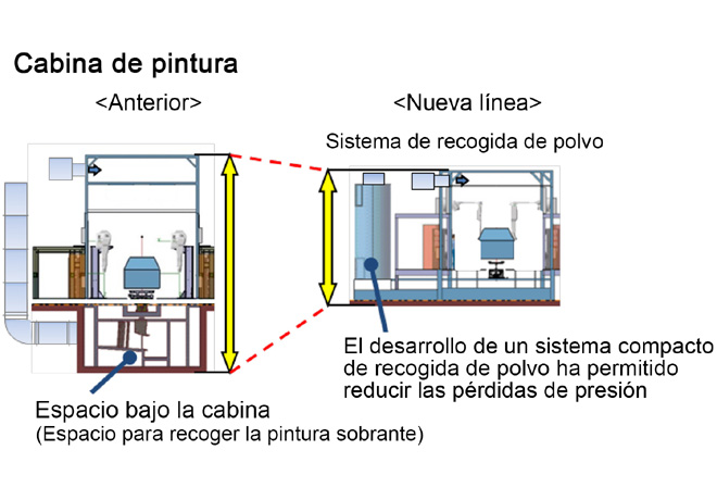 La reducción del espacio bajo la cabina de pintura ha supuesto la mayor contribución a la disminución de las dimensiones de la línea de producción. El desarrollo de un nuevo método, que emplea fuerza centrífuga para recoger la pintura que no se ha adherido a la carrocería de los vehículos durante el proceso de pintado, y la reducción del tamaño del equipamiento y de las pérdidas de presión también ha ayudado a recortar las emisiones de CO2.