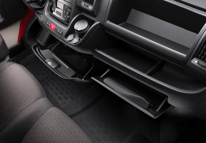 La modularidad y el confort están presentes desde el momento que el conductor entra a la cabina y encuentra al instante uno de los 13 prácticos portaobjetos para dejar allí lo que tenga en las manos. Dispone además, de una guantera refrigerada (con cerradura) y de un Soporte Escritorio (ideal para anotadores, Tablet, celular, etc) muy práctico pensando en la gestión de los próximos traslados. También se pueden conectar los dispositivos vía Bluetooth o vía USB regulables desde el volante.