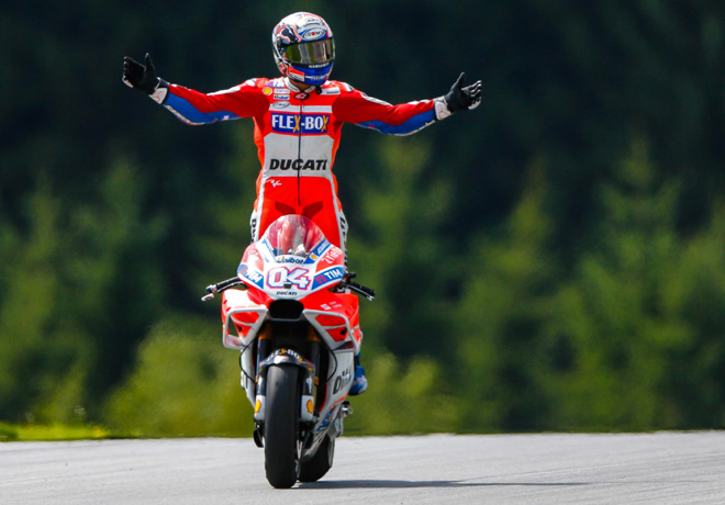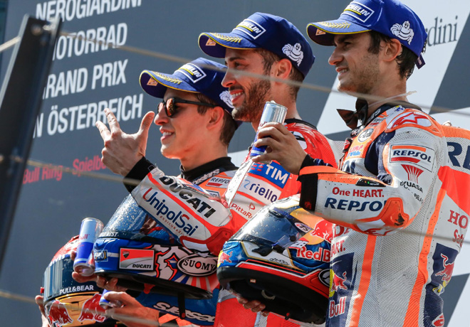 La última curva del Red Bull Ring fue testigo de uno de los mejores duelos de los últimos años. Andrea Dovizioso (Ducati Team) ya había demostrado su regularidad, y hoy confirmó que no teme el duelo cuerpo a cuerpo. Salió victorioso, nada más y nada menos que contra Marc Márquez (Repsol Honda Team), experto en este tipo de hazañas. Tercera victoria para Dovizioso en esta temporada.