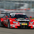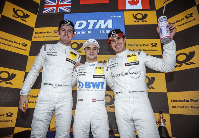 Lucas Auer con el Mercedes-AMG logró la victoria en la primera competencia del fin de semana disputada en el circuito de Nürburgring, de 3629 metros de extensión, y se coloca segundo en el Campeonato DTM a una sola unidad de Mattias Ekström (Audi), quien cometió el error de colocar gomas para piso seco cuando nuevamente empezó a llover, y en definitiva terminó en el puesto 15 con una vuelta perdida. El podio lo completaron Paul di Resta y Robert Wickens, que fue completo para Mercedes-AMG.