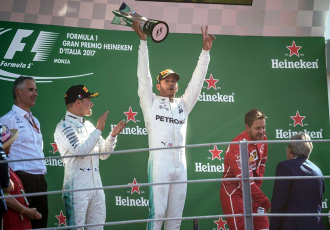 Contundente victoria de principio a fin de Lewis Hamilton con el Mercedes en el Gran Premio de Italia disputado en el legendario circuito de Monza, que le permite pasar al frente del campeonato de pilotos con 3 puntos de ventaja sobre Vettel, quien habÃa llegado a Italia como lÃder. Segundo quedó su compañero de equipo Valtteri Bottas y tercero Sebastian Vettel con la Ferrari, quien recuperó posiciones desde el sexto lugar de salida.