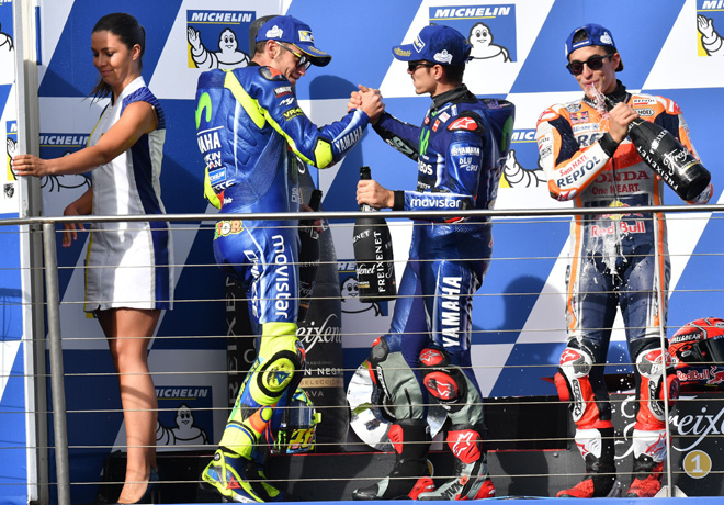 Al ver a Rossi atravesar el campo Viñales recuperó cuidadosamente algunos lugares, al tiempo que la lucha encarnizada por los puestos de vanguardia continuaba. Agachó la cabeza pero pronto tuvo que volver a empezar ya que el intercambio con Zarco y Andrea Iannone le costó caer al séptimo lugar tras abrirse en una curva. Volvió a subir en la clasificación, eliminando a Miller y Cal Crutchlow a falta de cinco vueltas, y utilizó la vida útil de sus neumáticos a la perfección en las últimas vueltas para superar a primero a Iannone y luego a Zarco casi sobre la línea de meta, quedándose con el tercer puesto por sólo 0.016s, a +1.826s del líder.