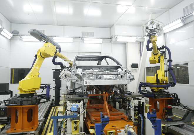 La siguiente sección está dedicada a las carrocerías. Las piezas estampadas anteriormente son llevadas a la línea principal donde son ensambladas por operadores y robots de soldadura de alta tecnología, armando la estructura de la carrocería. Al final de esta línea, las unidades son enviadas por túneles al sector de pintura.