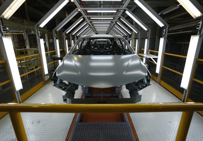 En el área de pintura, antes de aplicar color, se realiza un complejo proceso de protección, anticorrosión y sellado. Posteriormente, se lleva a cabo el pintado de las unidades por un sistema robotizado de pulverizado de pintura, para luego ser llevadas a los hornos de cocción para garantizar la protección y el sellado del color. Al final, se realiza un exhaustivo control de calidad bajo la exposición de luces especiales, y las unidades son llevadas a la planta de ensamble.