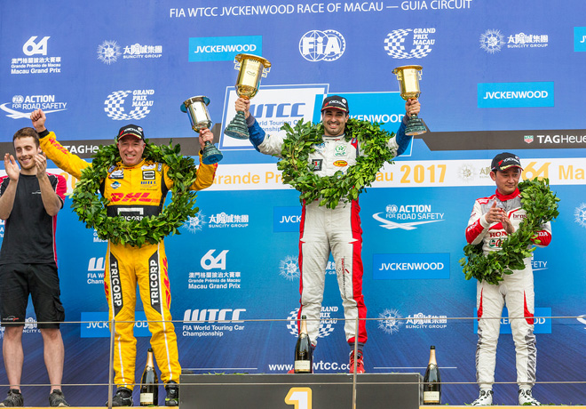 Mehdi Bennani ganó la carrera inaugural en Macao, después de que el contendiente al título del Campeonato Mundial de Turismos de la FIA Norbert Michelisz estuvo involucrado en un accidente que detuvo la acción a poco del inicio en las calles de Macao. Bennani hizo un comienzo perfecto desde su posición de poleman con su Citroën C-Elysée y nunca fue acosado por Tom Coronel, quien se consolidó en el segundo lugar.