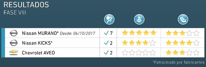 La octava y última ronda de resultados del 2017 del Programa de Evaluación de Vehículos Nuevos para América Latina y el Caribe, Latin NCAP, fue presentada hoy con resultados alentadores para el Nissan Murano y el Nissan Kicks y aunque con mejoras, un resultado de cero estrellas para uno de los autos más vendidos en México, el Chevrolet Aveo.
