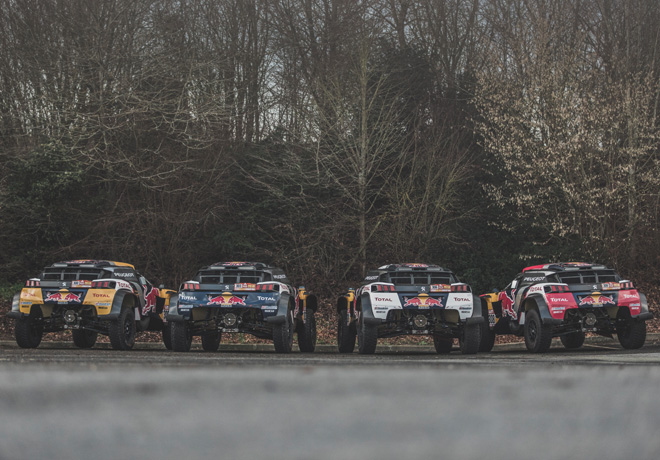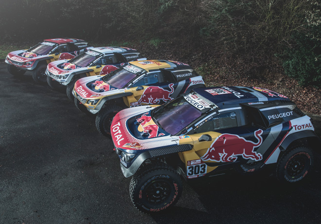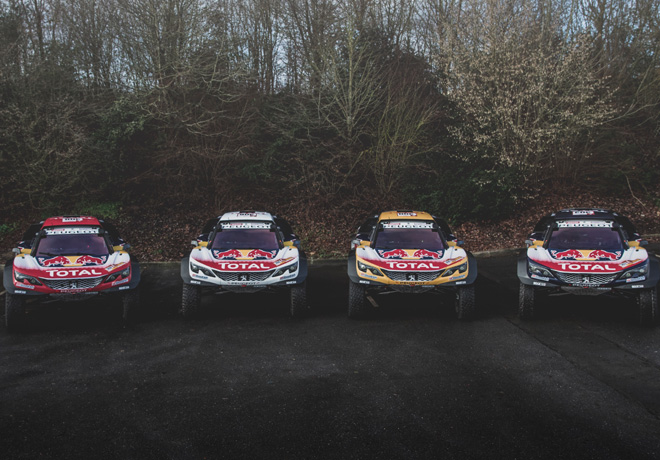 4 tripulaciones, 4 autos, 4 colores. Los Peugeot 3008DKR Maxi presentan cada uno colores distintivos en la parte delantera y en el techo: Stéphane Peterhansel/Jean-Paul Cottret (nº 300): color amarillo; Carlos Sainz/Lucas Cruz (nº 303): color azul; Sébastien Loeb/Daniel Elena (nº 306): color blanco, y Cyril Despres/David Castera (nº 308): color rojo.