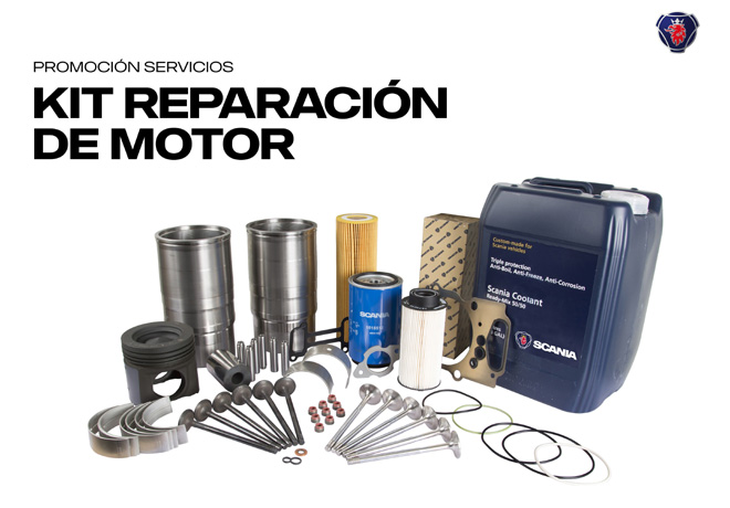 - Kit de reparación de inyección: La promoción cubre tanto los repuestos como la mano de obra y aplica para motores Scania de 5 y 6 cilindros. Cada kit incluye toberas, juntas de tapa de válvula, filtro separador de agua, kit juntas/anillos de apoyo estator, juego de juntas tóricas, kit de tope, kit de reparación de muelle, filtro de combustible y juntas de cobre.