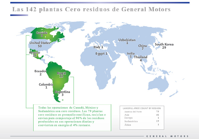 General Motors anunció la ampliación de su programa líder Cero residuos. Todas sus plantas de producción en Canadá, México y Sudamérica ahora reciclan, reutilizan, o convierten en energía todos los residuos producto de sus operaciones diarias. Con la reciente certificación obtenida para 27 nuevas plantas, General Motors posee ahora 142 plantas industriales y no industriales a nivel global que alcanzaron la meta Cero residuos; superando a cualquier otra empresa automotriz.