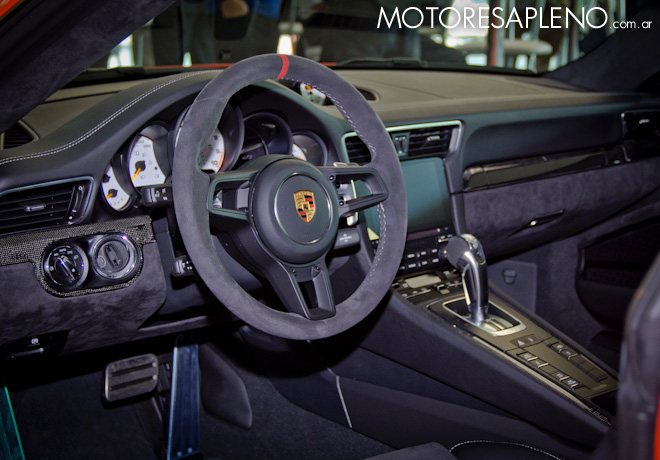 El interior de este deportivo de altas prestaciones ha sido adaptado a la experiencia de conducción del 911 GT3. El volante deportivo GT, con diámetro de 360 mm, proviene del 918 Spyder. Tanto conductor como pasajero disfrutan del dinamismo en unos asientos Porsche Sports Plus, con refuerzos laterales de sujeción y ajuste mecánico longitudinal. La altura y posición del respaldo tienen regulación eléctrica. Como el 911 GT3 es tradicionalmente un biplaza, la zona donde suelen ir los asientos traseros está cubierta.