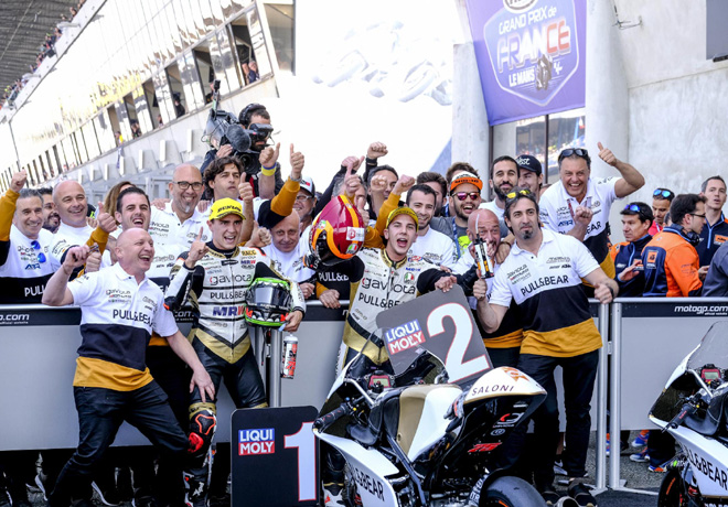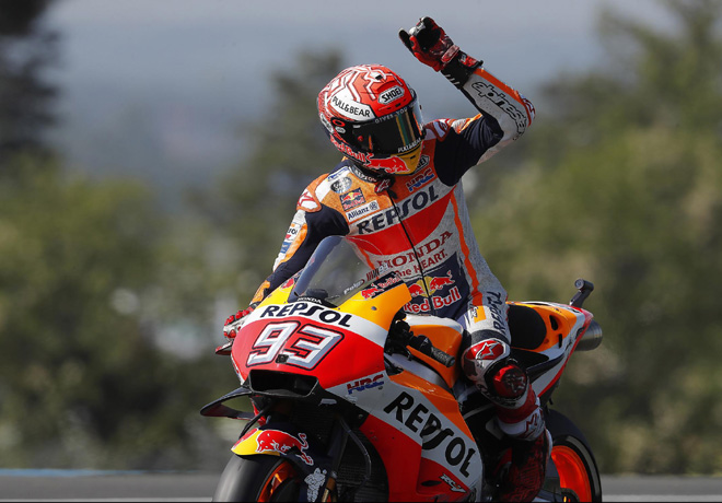 Marc Márquez (Repsol Honda Team) se impuso en una pista que no es excesivamente positiva para las características de la Honda. Le Mans parecía predestinada para las Yamaha, en especial para Zarco, que acabó cayéndose. Ahora, Márquez alcanza a Casey Stoner con 38 victorias en la clase reina; sólo le queda Jorge Lorenzo (39) por delante, y afianza su liderazgo con 36 puntos sobre Viñales.