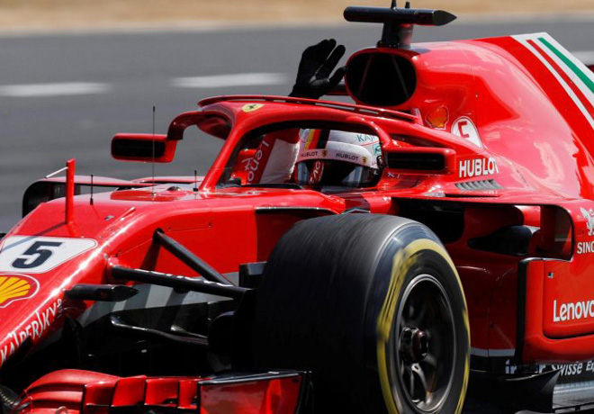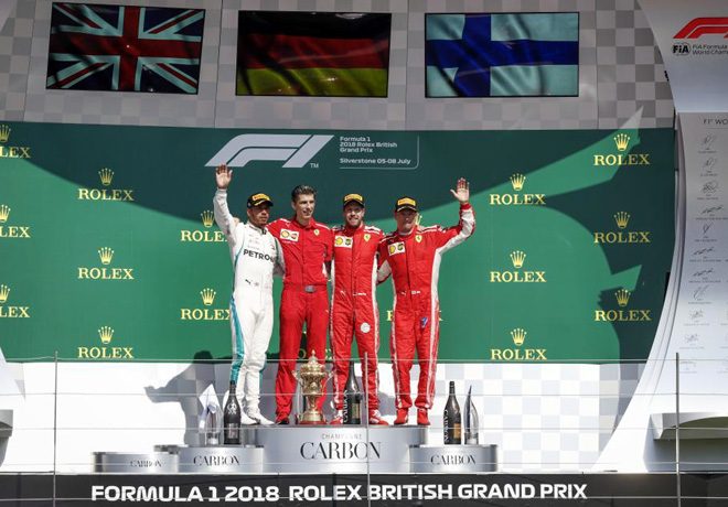 Las esperanzas del británico Lewis Hamilton de conseguir un récord de victorias en el Gran Premio de Gran Bretaña en Silverstone se esfumaron en la misma partida. El piloto de Mercedes, que ayer habÃa obtenido la pole position, tuvo una lenta salida y fue superado por Vettel y Bottas quedando tercero; pero en la primera curva fue tocado por Kimi Räikkönen que le hizo hacer un trompo para quedar en el puesto 18.