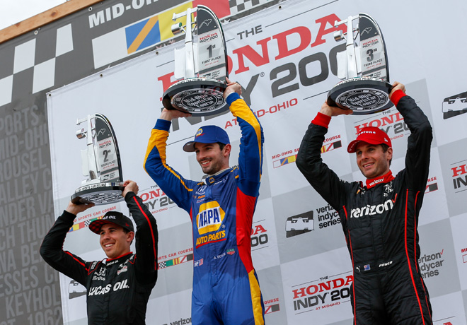 Rossi, quien ayer habÃa logrado la pole position, consiguió su cuarta victoria en la IndyCar Series y la segunda esta temporada después de la obtenida en Long Beach el 15 de abril. Este triunfo de Rossi fue el número 60 para Andretti Autosport en Indy; pero la primera en Mid-Ohio.