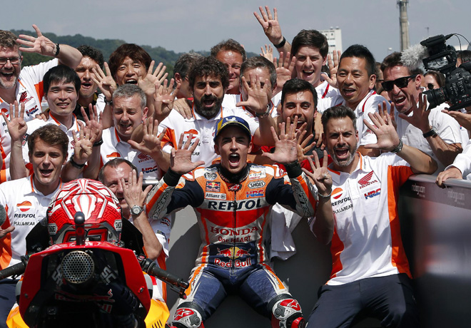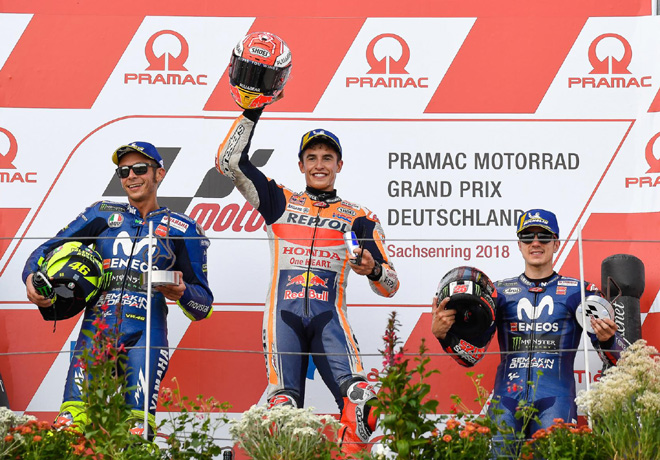 Ya van 66 victorias de Marc Márquez. Como bien predijeron los pilotos, la segunda mitad de carrera, y en especial el último tercio de la prueba, iba a decidir la batalla. Márquez se puso a liderar a falta de 17 vueltas para el final y no soltó el comando de la carrera para sumar su 66ª victoria, la 9ª consecutiva en Sachsenring y, lo que es más importante, otros 25 puntos que le acercan a su séptimo título. Lidera la tabla con 46 unidades sobre Valentino Rossi (Movistar Yamaha MotoGP).