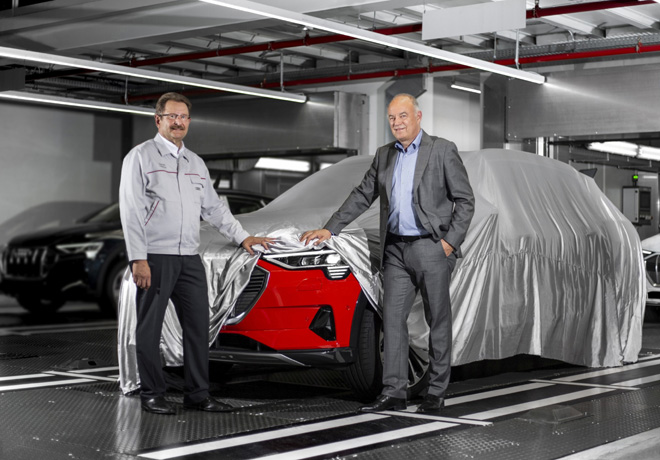 En color Rojo Misano y preparado para la ruta. Peter Kössler, Director de Producción y Logística de AUDI AG, y Patrick Danau, Director de Audi Bruselas, no pudieron resistir la tentación de ver rodar silenciosamente las primeras unidades de Audi e-tron saliendo de la línea de montaje.