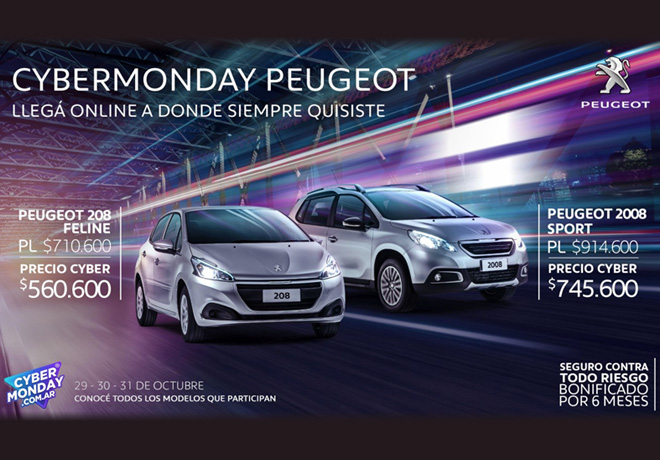 Atentos a las tendencias de consumo actual, Peugeot Argentina complementa sus 60 puntos de venta distribuidos a lo largo de todo el país, con su plataforma de e-commerce digital. Por eso, este año Peugeot participa del Cyber Monday con ofertas especiales que el cliente encontrará ingresando en cybermonday.com.ar/autos o desde peugeot.com.ar