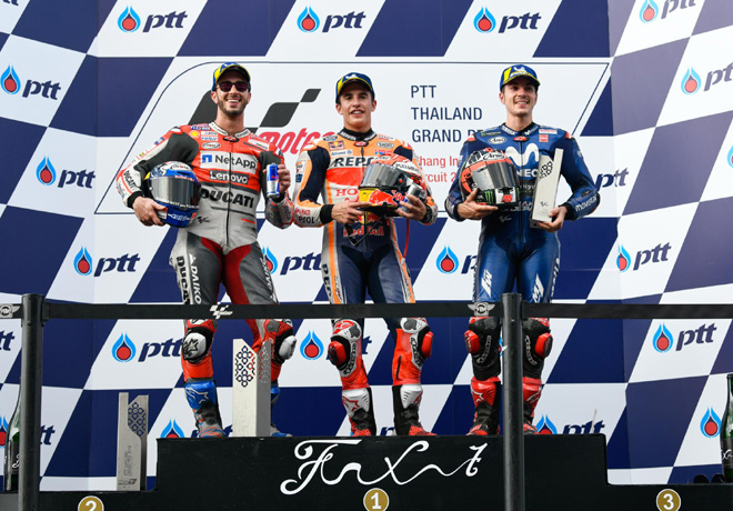 La carrera fue muy estratégica. Hasta 8 pilotos rodaron con opciones de victoria al inicio. Nadie quería apretar y todos optaron por guardar gomas debido a la alta exigencia a la que se ven exigidos los neumáticos en Tailandia. Las Yamaha y los dos favoritos se superaban unos a otros hasta que, faltando cinco vueltas, Dovizioso y Márquez cambiaron de ritmo.